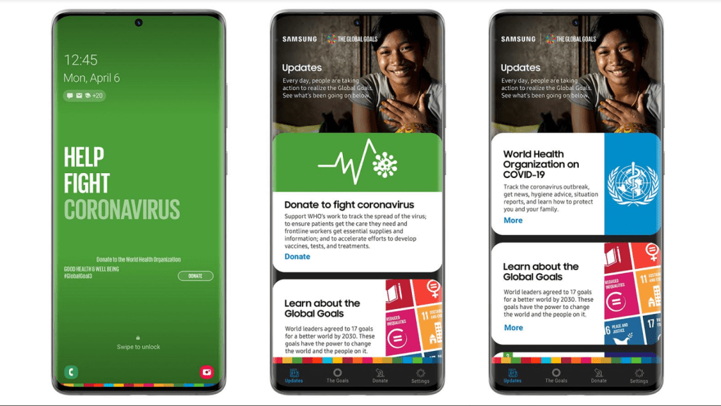 Además, la aplicación Samsung Global Goals ha ayudado a la Organización Mundial de la Salud (OMS) y los esfuerzos de ayuda del UNDP para la crisis inmediata y las repercusiones a largo plazo del COVID-19. Samsung y el UNDP trabajaron juntos para crear el contenido necesario para proporcionar a los usuarios de Galaxy información precisa y concisa sobre el virus y, en última instancia, para contrarrestar las crecientes tasas de desinformación. La comunidad Galaxy también usó la aplicación para dirigir el aumento de fondos al Fondo de Respuesta a la Solidaridad del COVID-19 de la OMS y el esfuerzo continuo del UNDP para crear resiliencia para aquellos profundamente afectados por la pandemia.