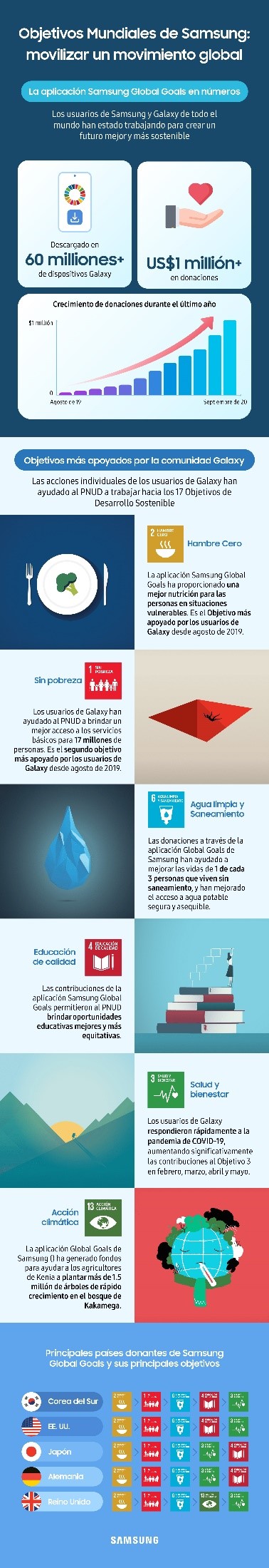 Recientemente, celebramos el primer aniversario de nuestra asociación con el Programa de las Naciones Unidas para el Desarrollo (PNUD), el organismo principal de las Naciones Unidas en la respuesta socioeconómica a la pandemia. Esta asociación nos ha permitido transformar el teléfono inteligente Galaxy en una plataforma poderosa a través de nuestra aplicación Samsung Global Goals (Objetivos Mundiales de Samsung) y movilizar a la comunidad Galaxy a hacer pequeñas acciones hacia el logro de los Objetivos Mundiales. Y gracias al uso dedicado de la aplicación por parte de nuestros fanáticos de Galaxy, nos complace anunciar que hemos recaudado más de US$1 millón en donaciones al PNUD.