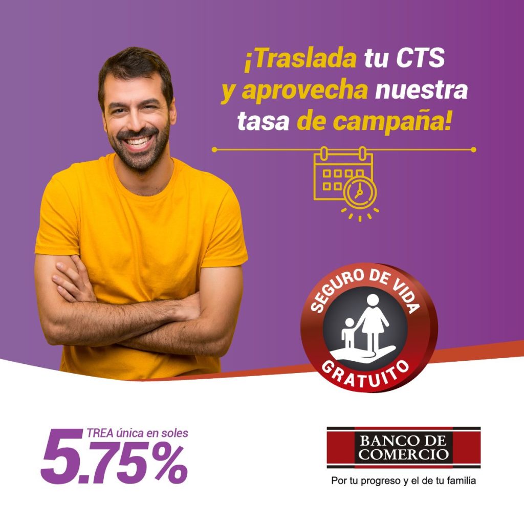 - La campaña depósito CTS del Banco de Comercio dispone de una tasa especial y competitiva de mercado de 5,75% TREA en moneda nacional a los clientes que trasladen su CTS o aperturen una cuenta.