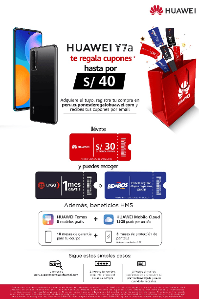 Hasta el 21 de febrero, Huawei ofrece cupones de descuento de hasta S/40. Los compradores del nuevo Y7a recibirán un cupón de descuento de S/30 en su tienda virtual y podrán elegir entre un cupón por un mes gratis de suscripción en América TV GO o un cupón para un combo personal en Bembos.