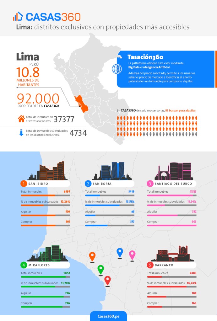 Asimismo, los distritos con más oportunidades para comprar una propiedad a un precio más accesible son Santiago de Surco con 963 propiedades y Miraflores con 796. Mientras que para alquilar, San Isidro y Miraflores en conjunto suman 1,326 propiedades con oportunidad de ahorro.