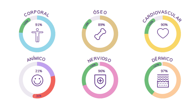 - Vector corporal: aspectos de la salud corporal: peso, IMC, masa musculoesquelética, Índice agua extracelular, etc.
