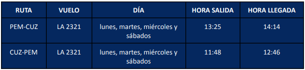 LATAM Airlines Perú suma esta ruta a su amplia red de promoción nacional y en diferentes partes de la región y del mundo, poniendo el foco de los turistas internos y extranjeros a estas dos regiones como importantes destinos turísticos y comerciales, apostando por la reactivación económica e impulsando la conectividad del país.