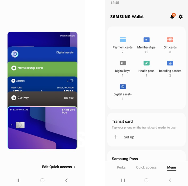 - Samsung Wallet combina Samsung Pay con Samsung Pass para almacenar y acceder a IDs, tarjetas de pago y fidelización, llaves y más