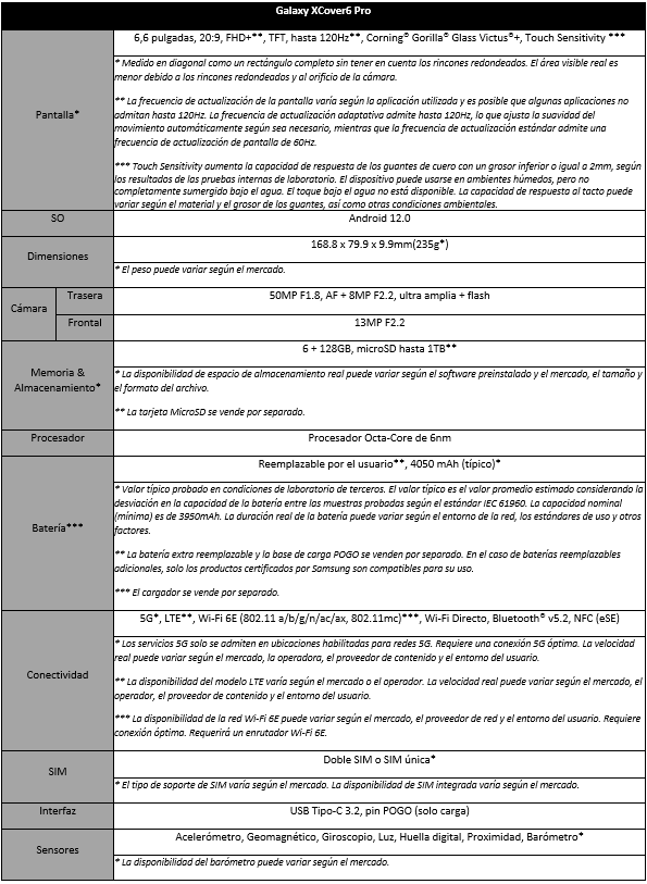 “La expansión de la tecnología móvil en el entorno laboral significa que los negocios ya no están confinados a una oficina, y las empresas deben evolucionar para mantenerse al día con este panorama en constante cambio”, dijo KC Choi, vicepresidente ejecutivo y head del Equipo B2B Móvil Global, Negocios de MX en Samsung Electronics. “Creamos la serie Galaxy XCover Pro para brindar a las empresas un dispositivo móvil lo suficientemente fuerte como para apoyar los rigores de los negocios en primera línea. Estamos entusiasmados de ampliar aún más este compromiso con la presentación del Galaxy XCover6 Pro, un dispositivo que combina una durabilidad continua con una conectividad perfecta para desbloquear el éxito de empresas de todas las formas y tamaños”.