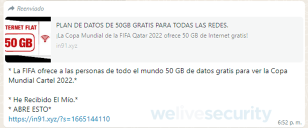 ESET, compañía líder en detección proactiva de amenazas, identificó un fraude que circula por mensaje vía WhatsApp, el mismo generalmente llega a través de un contacto conocido (o de un número desconocido) y dice “Plan de datos de 50GB gratis para todas las redes. La FIFA ofrece a las personas de todo el mundo 50GB de datos gratis para ver la Copa Mundial Catar 2022”.