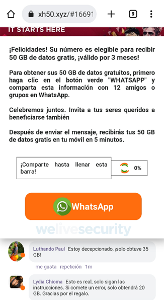 Luego, y como suele suceder en este tipo de engaños, para poder avanzar y recibir el supuesto premio, la campaña establece como requisito que primero se comparta el mensaje con 12 contactos o grupos de WhatsApp. De esta manera los cibercriminales consiguen que el mensaje fraudulento siga circulando y es por esta misma razón que el mensaje suele llegar desde un contacto conocido.