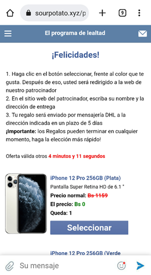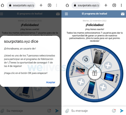 Sin importar qué opción se elija, el engaño redirige a un nuevo sitio web que intenta hacer creer a la persona que fue seleccionada para participar en un programa de fidelización y que por ello puede participar de un juego (una ruleta) para obtener un iPhone o un iPad.