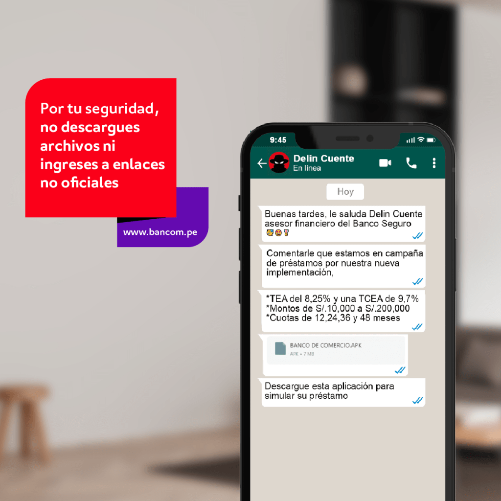 Si crees que has sido víctima de fraude financiero, es importante que actúes de manera rápida y repórtalo a tu banco inmediatamente. Además, si por alguna circunstancia ingresaste datos en alguna aplicación de fraude, por favor inmediatamente llama a Bancom para bloquear tu tarjeta al (01) 513-6000 o al teléfono 512-2030 con atención las 24 horas y reporta el hecho a nuestro buzón de prevención del fraude: prevenciondefraude@bancom.pe.