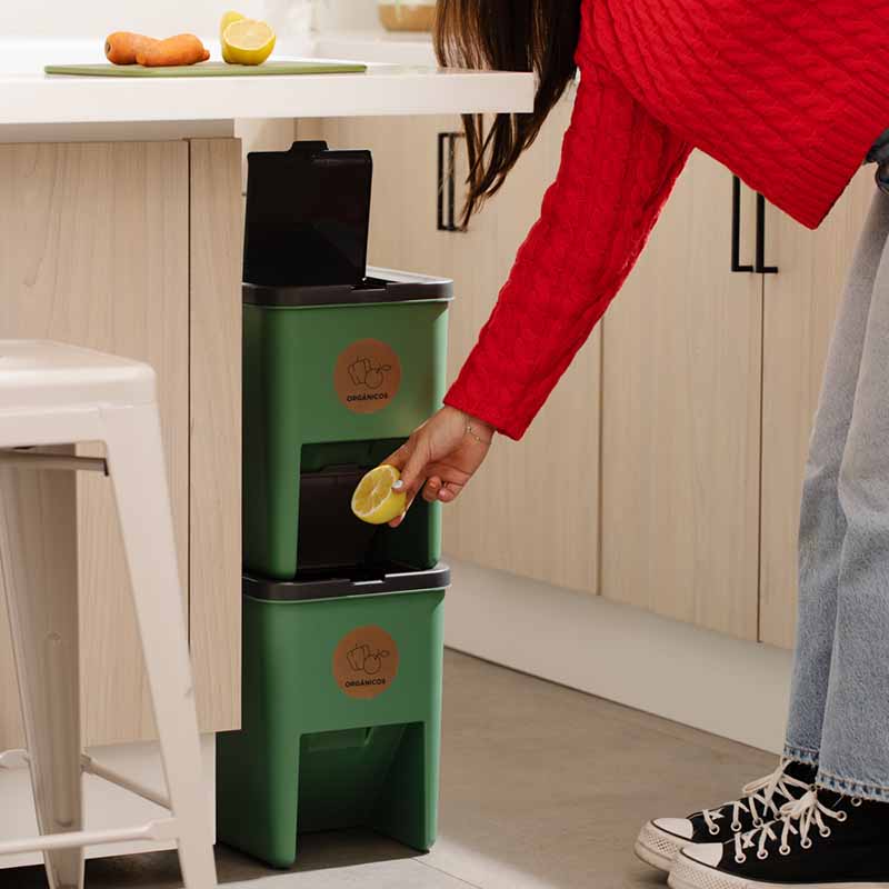 - Otras opciones sostenibles incluyen el basurero apilable fabricado en plástico pp, que cuenta con un sistema de succión para bolsas, manillas de traslado y la opción de mantener la tapa abierta para mayor comodidad. Ideal para reciclar.