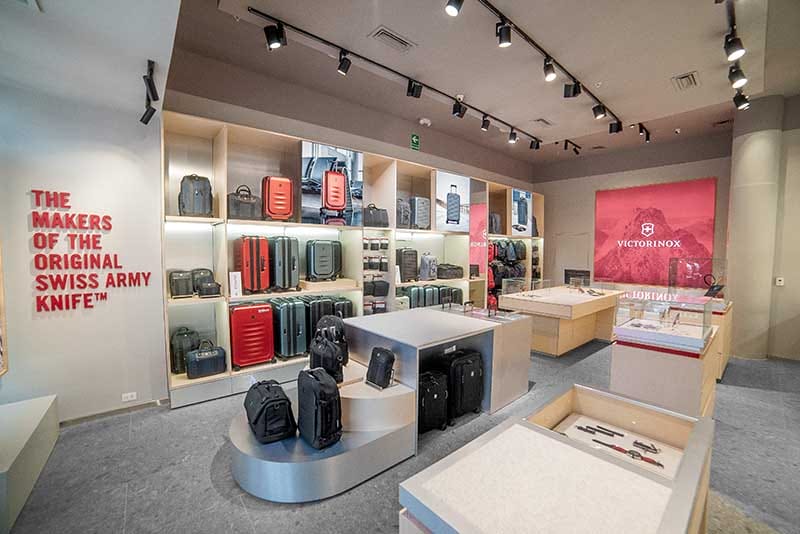 El nuevo concepto de diseño retail de la marca integra elementos del estilo e identidad suiza de Victorinox, creando un espacio moderno, premium y acogedor. El lado izquierdo de la tienda se diseñó para albergar artículos de viaje, desde billeteras, mochilas ejecutivas, hasta opciones de equipaje, con un enfoque en destacar las funciones de las diferentes gamas.